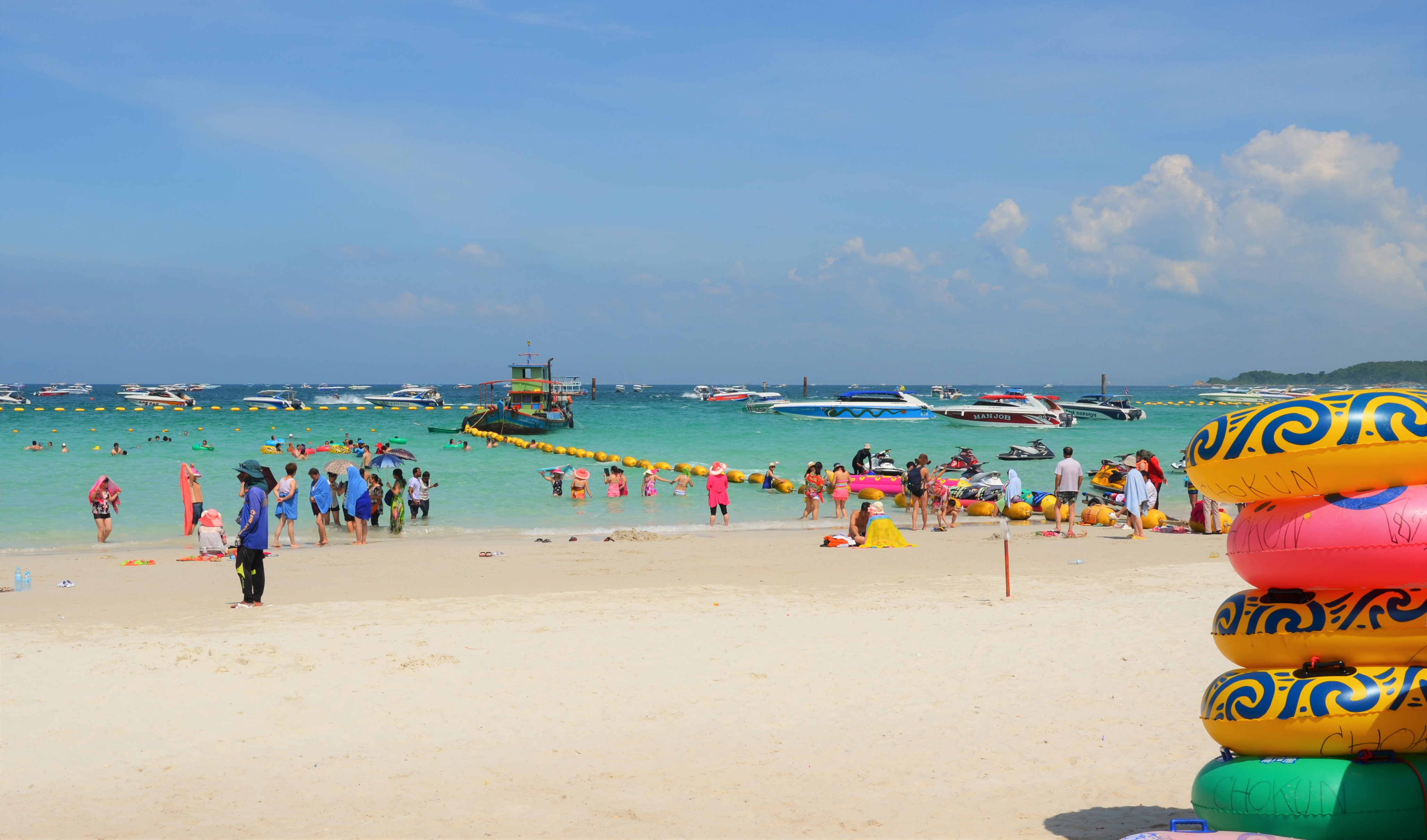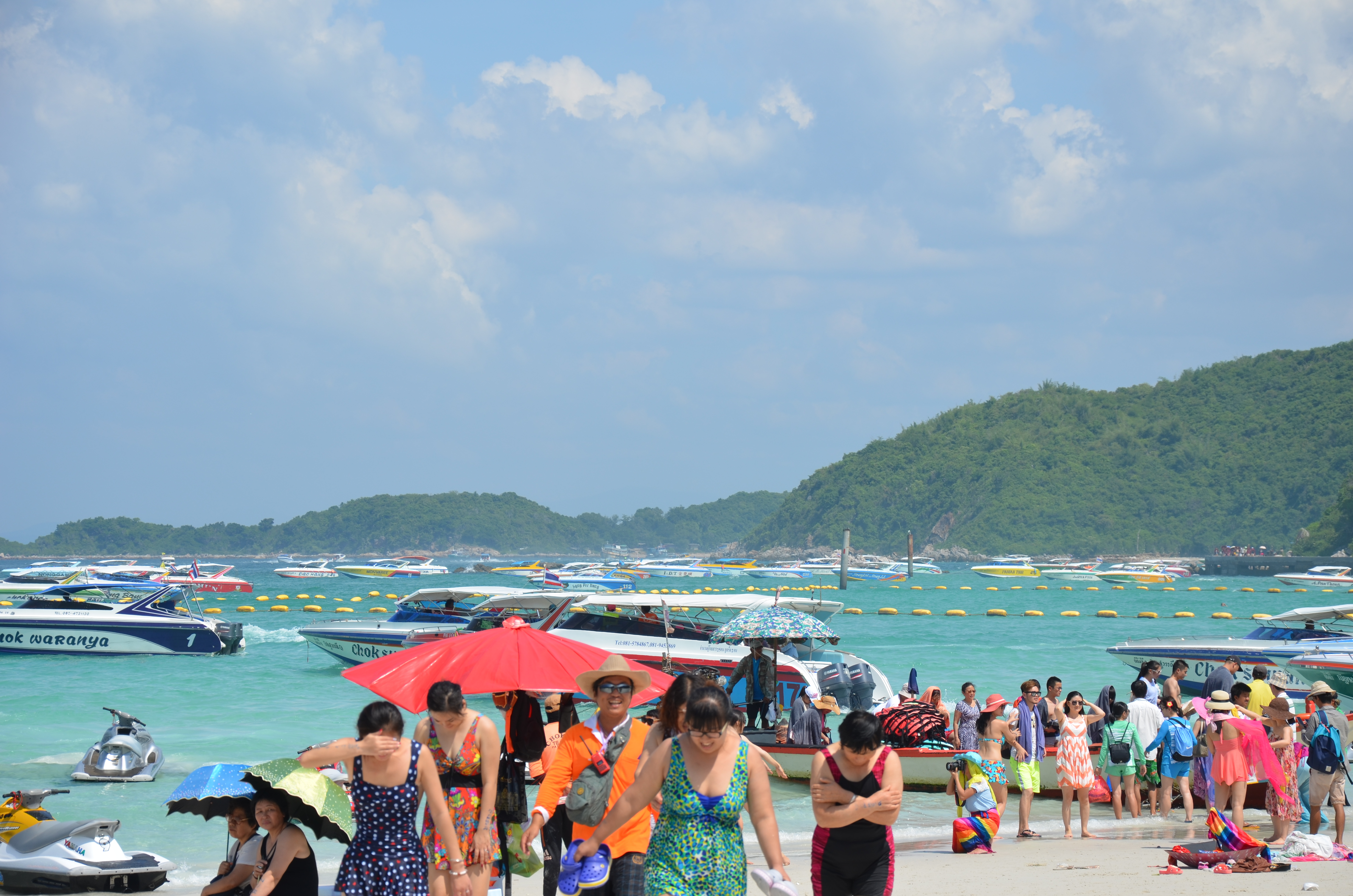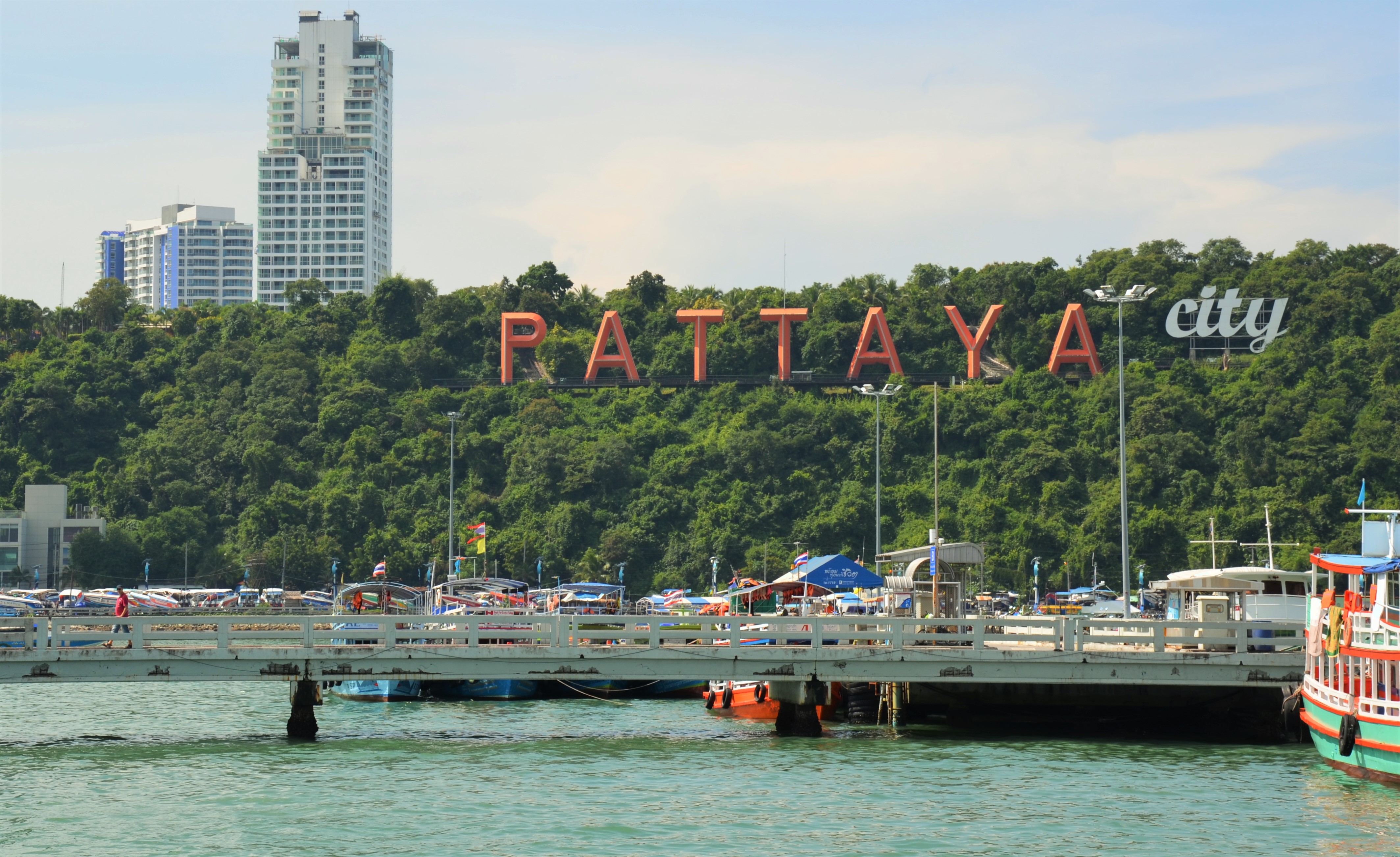 Ko Larn hat wunderschön klares Wasser und man ist für 30 Baht schnell drüben. Das Ticket unbedingt direkt auf dem Boot kaufen, nicht vorher bei einem der zahlreichen Schlepper. Ich setze dann immer mein gelangweiltes Gesicht auf, als wenn ich schon jahrelang hier fahre und genau Bescheid weiß, tatsächlich funktioniert das immer und nie spricht mich jemand an und will mir etwas verkaufen. Wer Lärm mag und da sein mag wo richtig was los ist, der ist auf Ko Larn richtig. Ich fand es ganz entsetzlich und habe das nächste Boot zurückgenommen ohne auch nur einmal im Wasser gewesen zu sein. Mich hat dieses Riesenspektakel mit hunderten von Speedbooten, Jetskis, Musik und tausend Leuten sehr abgeschreckt. Aber man weiß es nicht vorher und da ich ja auch schon einige von den schönsten Stränden der Welt gesehen habe, bin ich nicht so leicht zu begeistern. Das mag eben für andere wieder ganz anders aussehen und man kann sich auf Ko Larn mit Motorrad-Taxis zu weiteren Stränden bringen lassen und auch das schöne begrünte Inselinnere anschauen.
